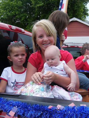 July 4th: I took Chris to his dad for the 4th of July weekend, stayed at my mom's house, and picked him back up to come home when he was done. While I was there, I got to help my mom put a float in the parade for my dad's bike shop. Peyton didn't ride in the back for the parade, but she got to enjoy it before we started. Jaycee and Kimber had fun throwing candy and I had a blast squirting the crowd with a squirt gun.